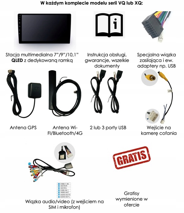 - Pełne okablowanie niezbędne do prawidłowego połączenia z oryginalną instalacją w samochodzie, w tym moduł CANBUS, jeśli jest wymagany.