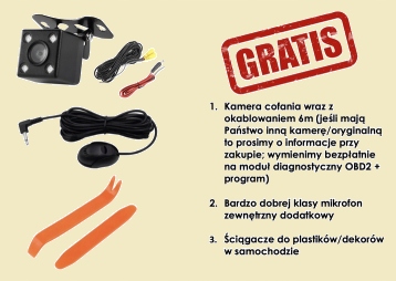 - GRATISY: kamera cofania z przewodem 6m, mikrofon zewnętrzny na przewodzie 3m oraz 2 x plastiki do zdejmowania dekorów